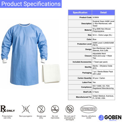 The Goben Medical XL Surgical Gown (GOB09) is engineered to provide reliable AAMI Level 3 protection for surgical personnel and patients against fluid penetration and microbial transfer in critical zones.